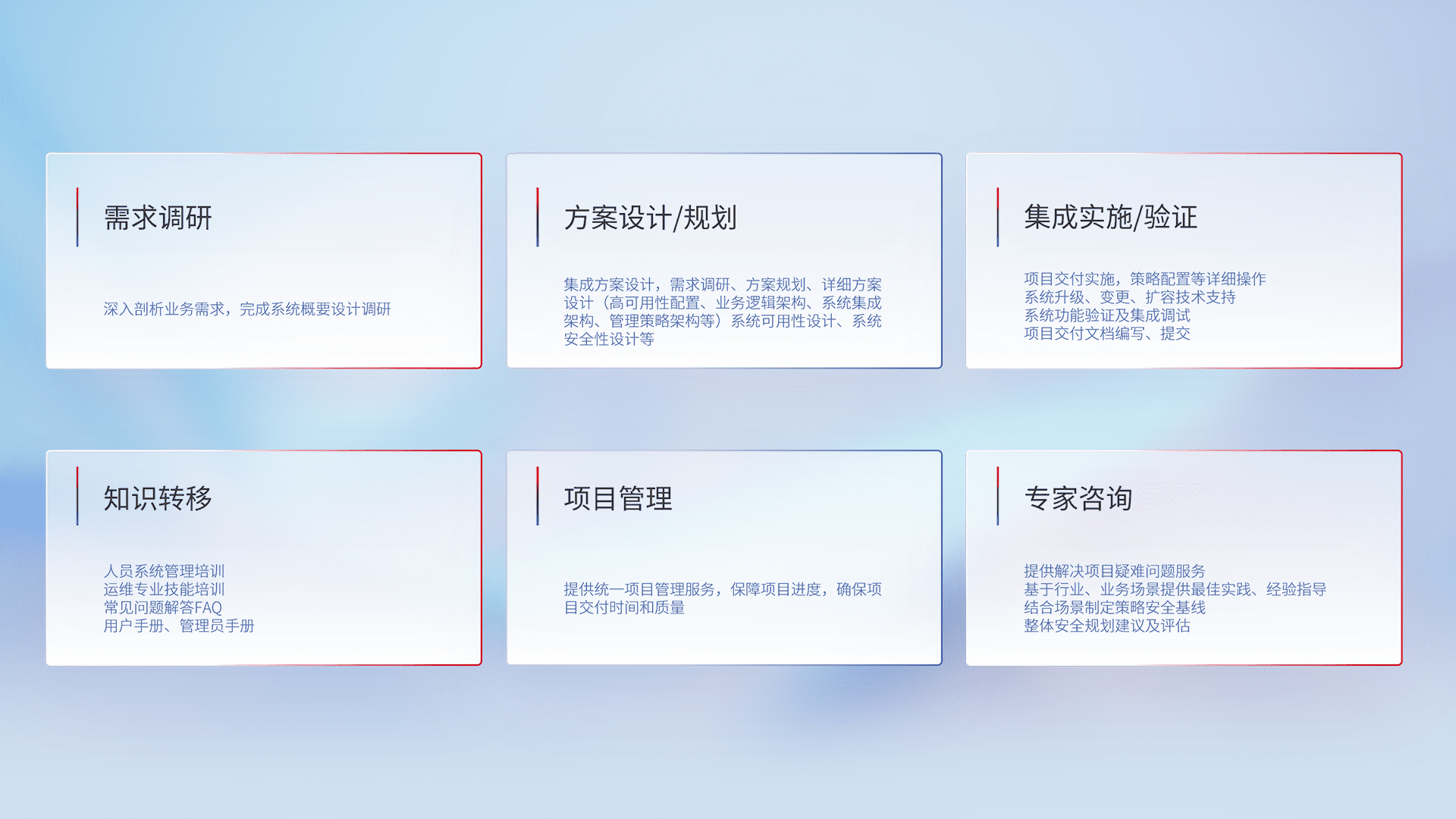 针对客户行业特性,,,,将宏观的安全战略和需求,,通过专业的交付服务,,实现项目落地,,,,为客户提供标准规范的集成交付服务。。。